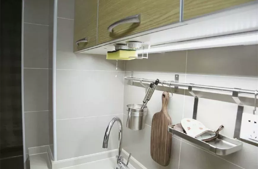 如果没有那么多厨房电器的话,就可以利用水槽专用伸缩架,置物板的高度可调节,而且每层置物板都是由多个小板组成,可以让开水槽管道,灵活适应空间。