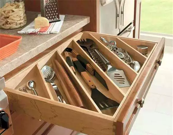 抽屉内部的空间利用很容易被忽略,但其实利用分隔栏不仅可以最大限度利用空间,还好取好放,用起来很顺手。看着上面整齐清爽的抽屉内部是不是做饭的心情都好了。