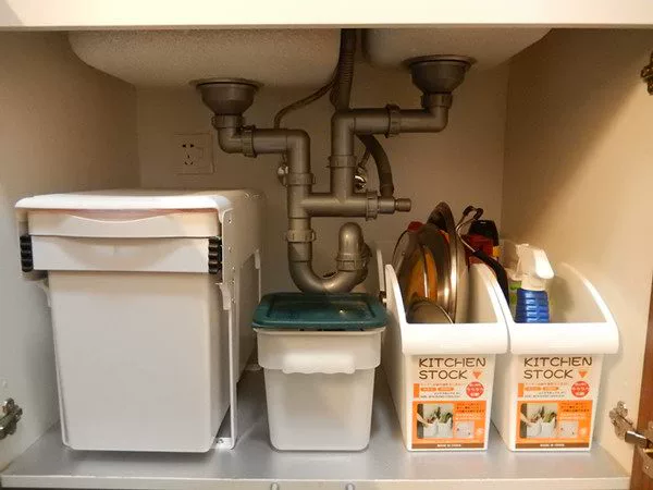 厨房的地柜也要花些心思,比如水槽下面的橱柜。上图中收纳了三件厨房电器,还利用小伸缩杆收纳清洁用品,伸缩杆的利用,大家要用小本本记下来哦。